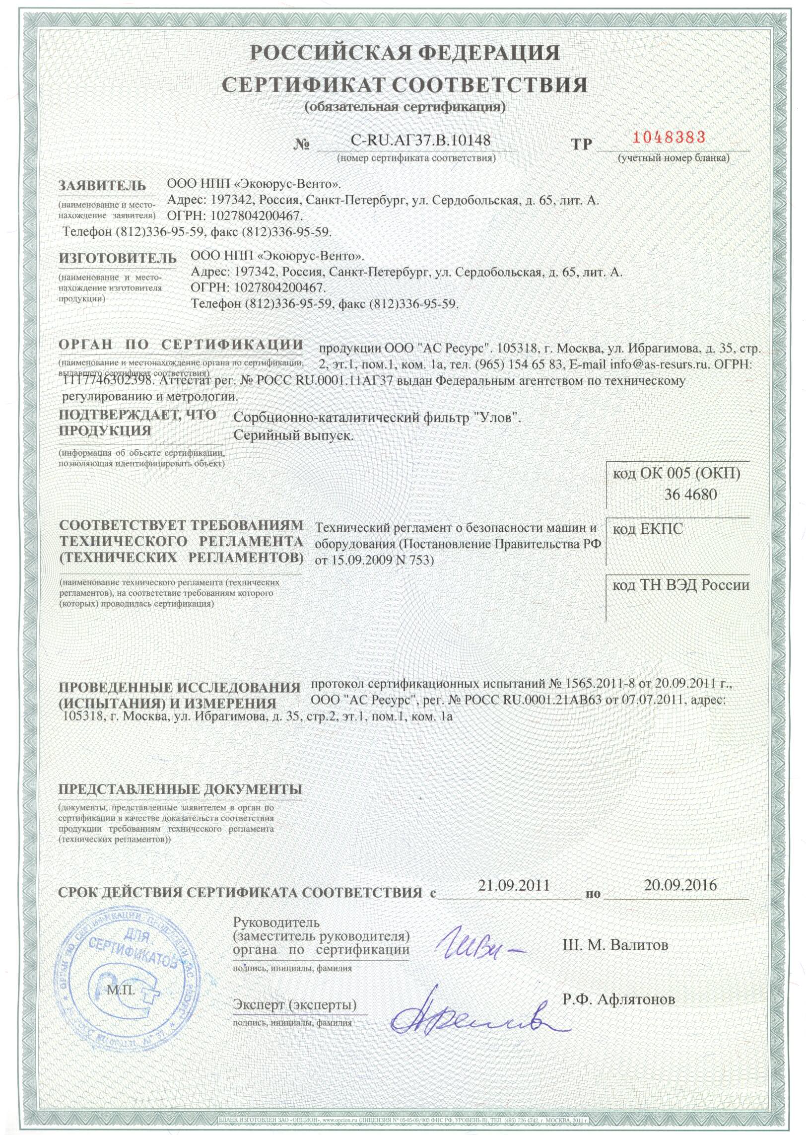 Сорбционно-каталитический фильтр «Улов» предназначены для очистки воздуха от газообразных соединений стирола, фенола, формальдегида, метакрилата, акролеина, уксусной кислоты, ацетальдегиду, винилацетату с начальной концентрацией до 10 мг/м3 при комнатной температуре 20-30оС, не требует предварительного подогрева воздуха перед очисткой. Очистка производиться путём прохождения загрязненного воздуха через гранулы алюмохромфосфатного сорбента-катализатора, расположенного в сетчатых кассетах внутри корпуса фильтра.