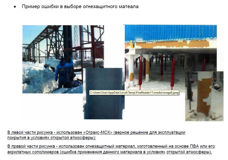 Однако часто встречаются ошибки в проектах на огнезащиту, в которых применена белая огнезащита (с лаком) для конструкций, подвергающихся некому воздействию.